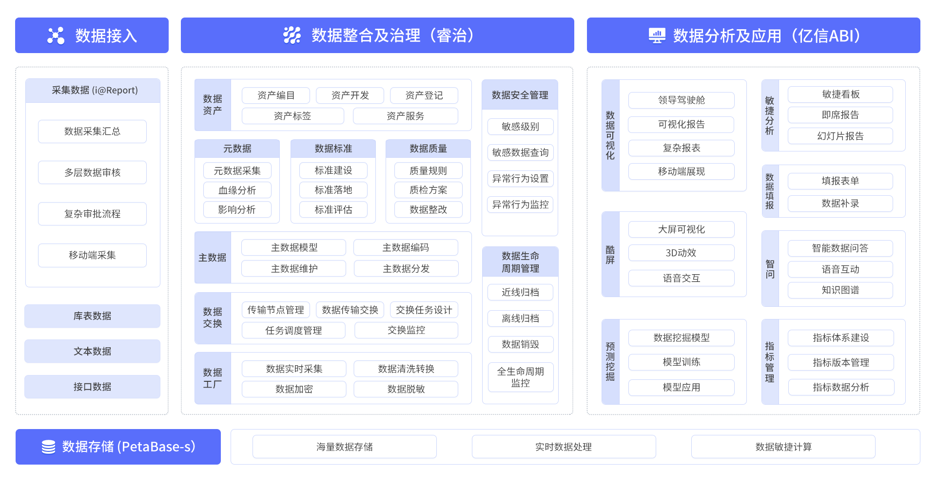 也正是憑借大數據領域的經驗沉淀,億信華辰積極布局數據治理領域,百余次產品迭代,打磨出睿治智能數據治理平臺并榮獲DAMA中國數據治理優秀產品獎,形成包含元數據管理、數據標準管理、數據質量管理、主數據管理、數據集成管理、數據交換管理、實時大數據管理、數據資產管理、數據安全管理、數據生命周期管理等十大功能模塊的數據治理產品方案,可自由組合快速滿足政企用戶數據治理全場景應用,助力數據標準落地,提升數據質量,實現數據資產化。