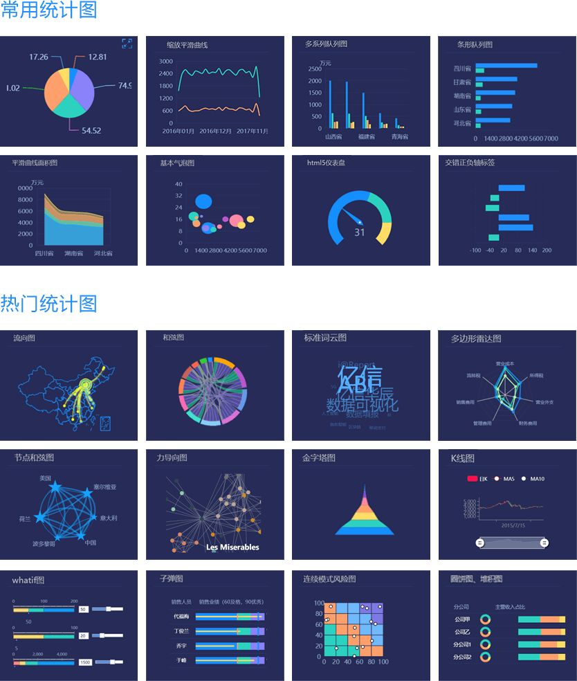 ABI采用JS、FLASH、HTML5三種技術(shù)自主開發(fā)統(tǒng)計圖,豐富的統(tǒng)計圖保證了其具有美觀的圖形展現(xiàn)能力,除了常用的柱狀圖、線狀圖、條形圖、面積圖、餅圖、點圖、儀表盤、走勢圖外,還支持和弦圖、圈餅圖、金字塔、漏斗圖、K線圖、關(guān)系圖、網(wǎng)絡(luò)圖、玫瑰圖、帕累托圖、數(shù)學公式圖、預(yù)測曲線圖、正態(tài)分布圖、迷你圖等,樣式包括2D、3D、EXCEL、AUTUMN、FLASH等;通過組合設(shè)計可以搭配處上千種視覺效果。