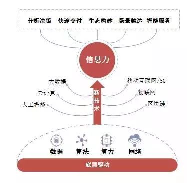 隨著傳統(tǒng)產業(yè)全面數字化轉型升級,通過組裝信息力的底層驅動可以構建新的技術引擎,如大數據、人工智能、云計算、移動互聯網5G、物聯網、區(qū)塊鏈等。它們如馬車一樣拉動著企業(yè)快速增長,并為企業(yè)數字化轉型賦能。比如谷歌、亞馬遜、BAT等互聯網公司,正在以人工智能、大數據、云計算、區(qū)塊鏈等創(chuàng)新技術顛覆舊秩序。信息力已成為這些企業(yè)新的核心競爭力。