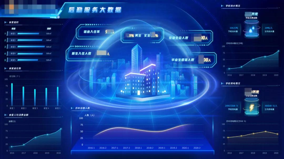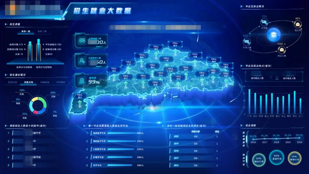 為輔助校領導在宏觀層面掌握校園數據,我們分別從招生就業、學生工作、國有資產、圖書典藏、科研成果、后勤服務、發展規劃、財務、教務、人事以及全校核心數據等11個方面全面展示有效信息,并且橫向覆蓋各學院及各部門的數據信息和工作內容。通過對接校方數據中心保證數據事實的準確性、及時性,為管理團隊科學決策提供了有效的數據支撐。